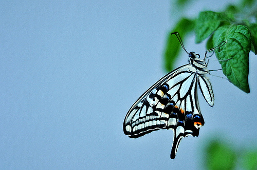 ベランダのミニトマトの葉っぱに、アゲハ蝶が飛んできました。