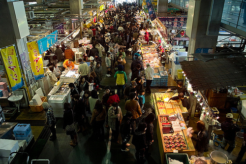 ~9:00までは、夜中競られた海産物を生で売ってます。