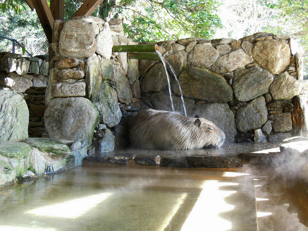 今日は寒くなかったせいか、湯船につかっているカピバラさんはいませんでしたが、打たせ湯にあたっていました。
