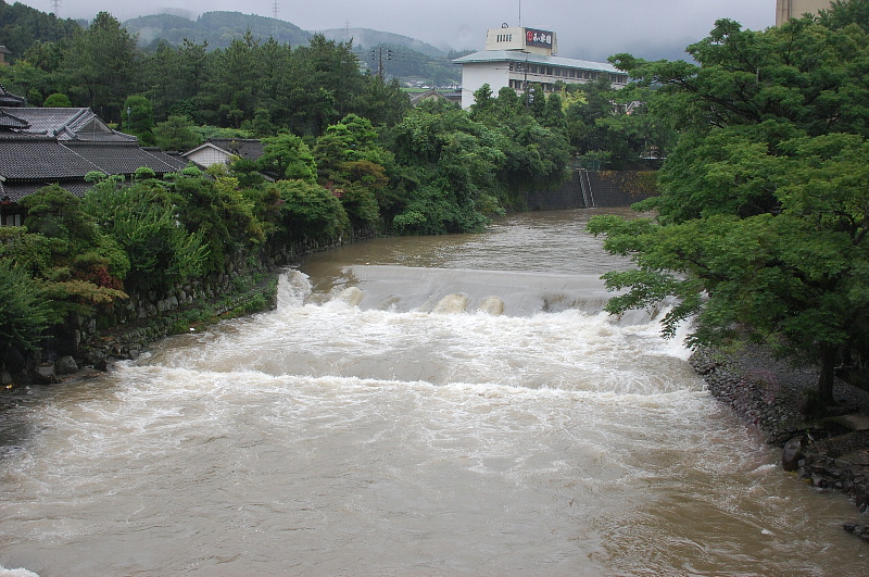 いつもは静かな嬉野川も濁流となって激しく流れている様子。
